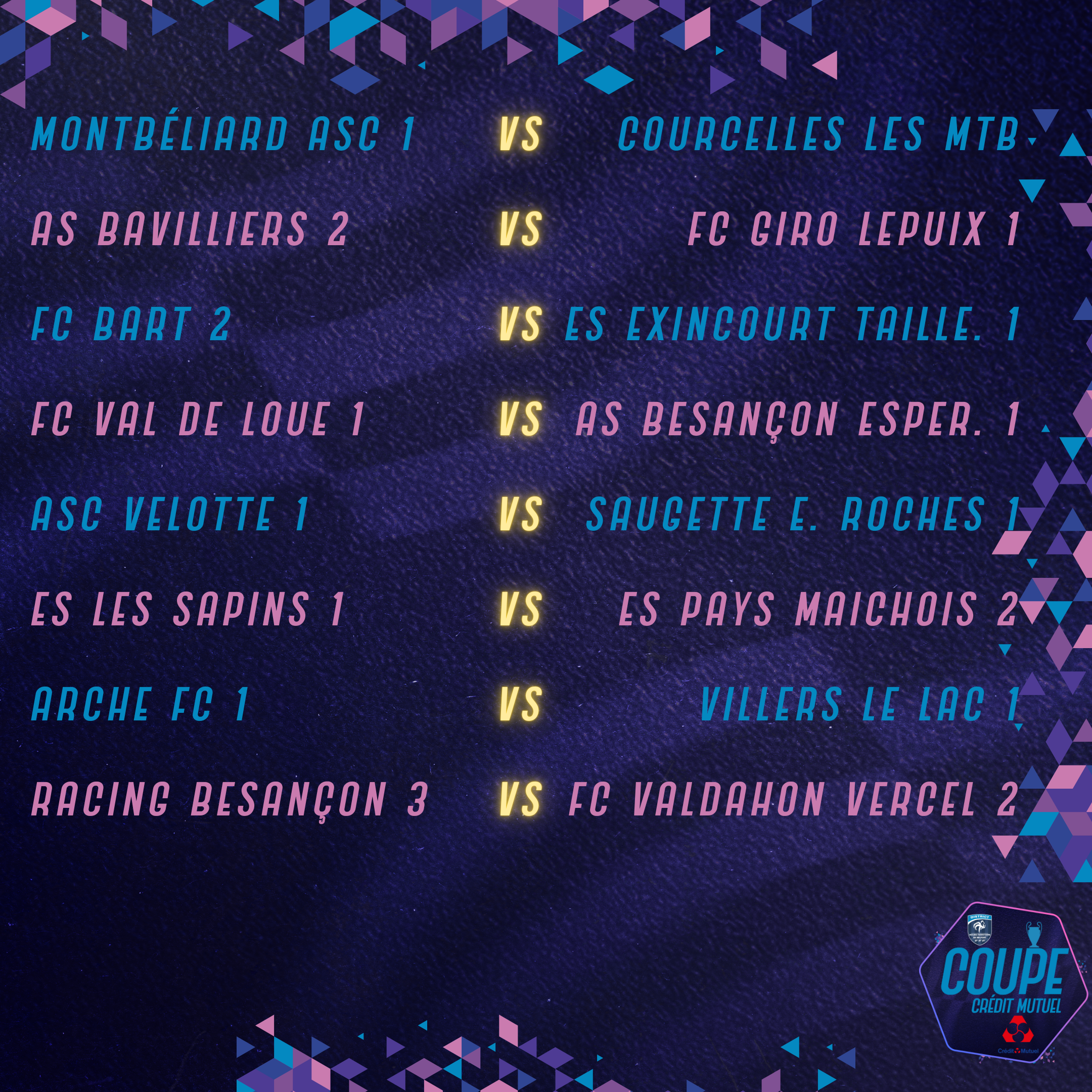 Le District de Football Doubs Territoire de Belfort vous propose de découvrir les affiches des 1/8ème de finale de la Coupe Crédit Mutuel :