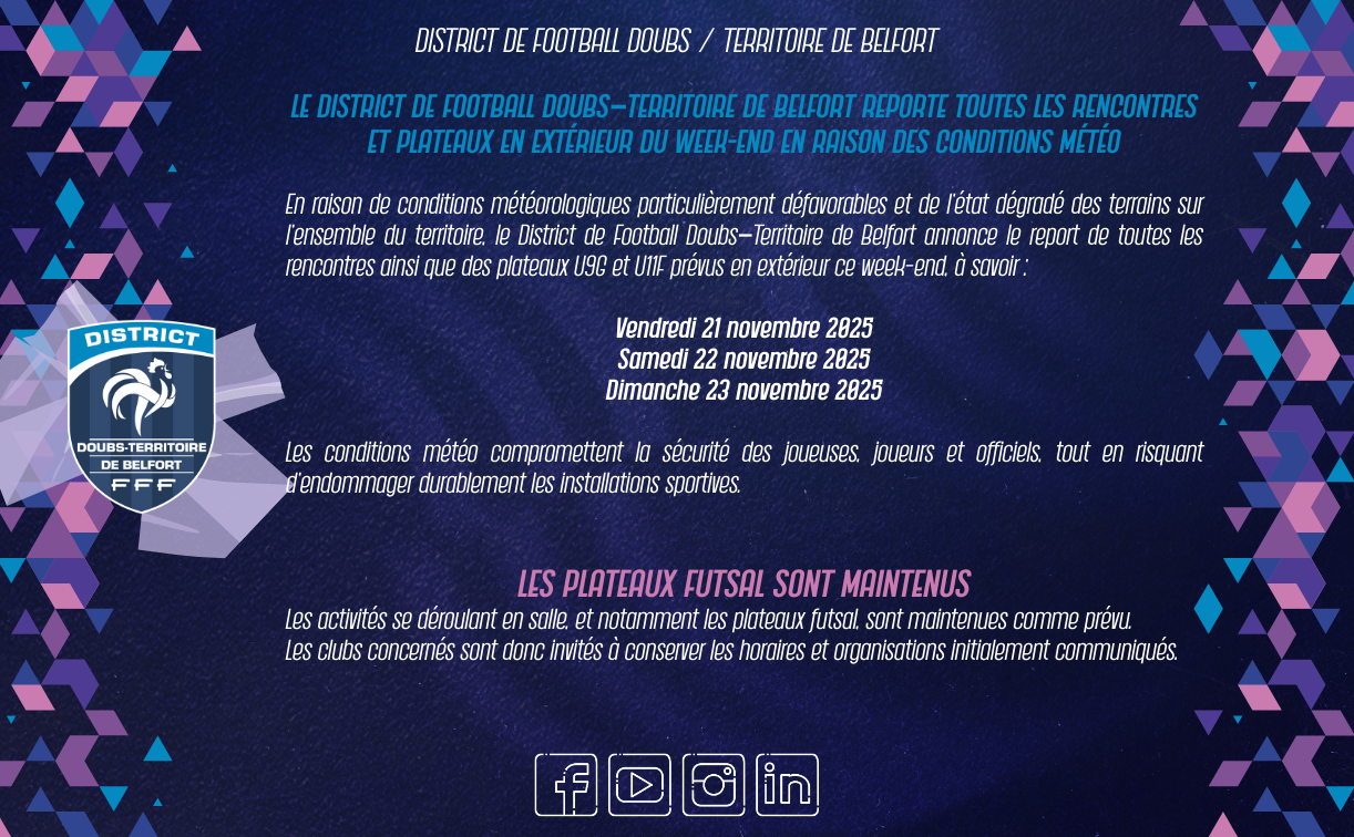 En raison de conditions météorologiques particulièrement défavorables et de l’état dégradé des terrains sur l’ensemble du territoire, le District de Football Doubs–Territoire de Belfort annonce le report de toutes les rencontres ainsi que des plateaux U9G et U11F prévus en extérieur ce week-end.